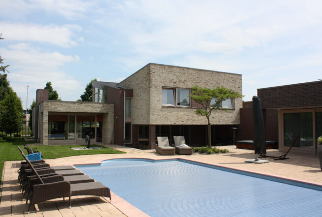 Prachtige en ongewone levensloopbestendige gezinswoning met een bijzondere ruimtelijke organisatie. De hoofd leefruimtes bevinden zich in een los bungalow volume aan de achterkant van de woning.
