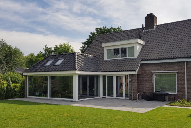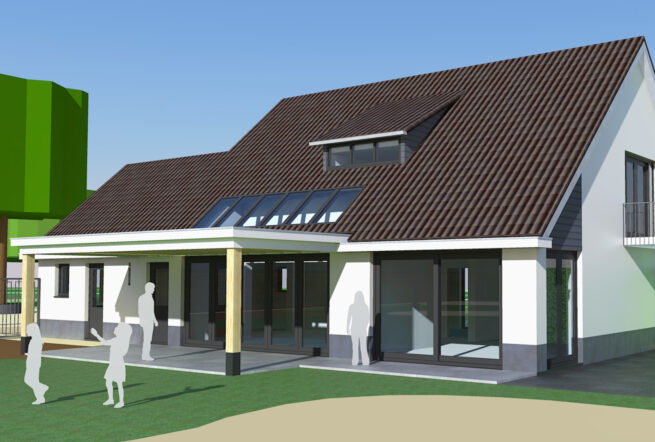 Eigentijds modern vormgegeven woonhuis met als basis een strakke zwarte kubus met articulaties in het metselwerk, met hier tegenaan enkele open en gesloten volumes in licht plaatmateriaal.